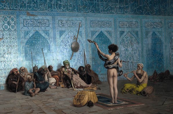 One of the most unusual paintings is a realistic painting by Jean-Leon Gerome, The Snake Charmer, which depicts a naked boy performing in front of audiences with a giant snake curling around him.
