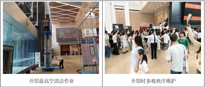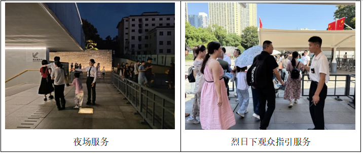 客流高峰时,全馆立即切换“高效服务模式”:票务员快速检票并贴心提醒,安检员严谨排查违禁物品还帮忙搬运大件物品,安全员在易拥堵区域分流及主动指引;督导员则全盘调度协调加开通道,确保参观井然有序。即便到了午餐时段,大家也只是轮流快速吃饭,半小时不到便回到岗位,没人抱怨“累”,只想着“别让观众等太久”。
