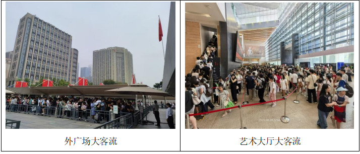 节前未雨绸缪,全链条备战筑牢安全有序基石。以“安全、有序、高效”目标,制定多维度预案:硬件上,增设人工检票窗口、临时安检通道、蛇形通道,减少观众排队等候时间;易聚集区域增派安全人员并设计单向参观流线,从源头杜绝人流对冲与堆积隐患。软件上,全面排查照明、安防、展陈设备,防范持续高峰可能引发的故障风险;人员培训强化服务技能与态度,开展多轮应急演练,排查风险点完善处置方案。