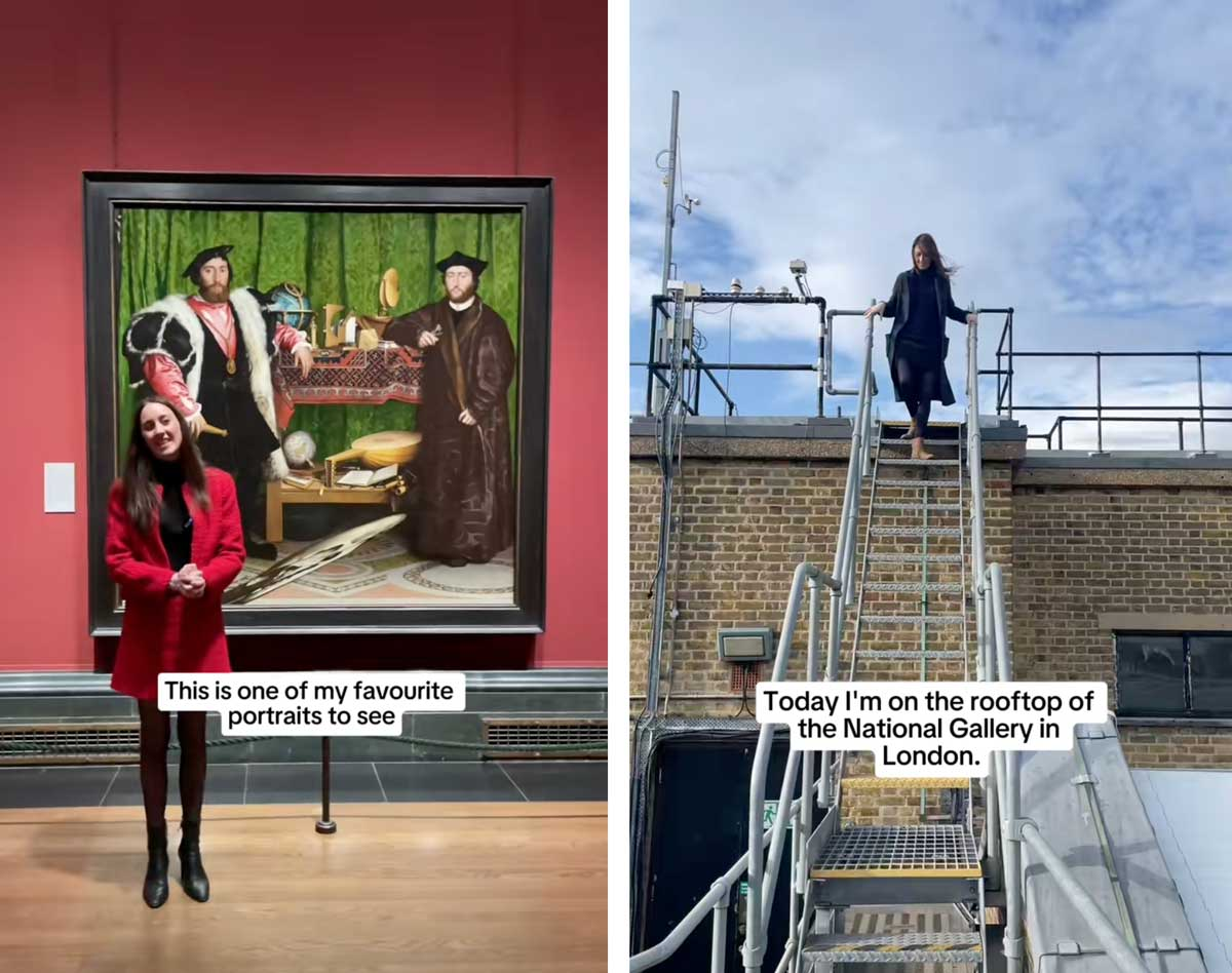 有一个关键环节叫“想法实验室”(ideas lab)——这是一个闭馆活动,入选创作者可在此探索英国国家美术馆,结识博物馆研究员,并发现意想不到的故事。例如,一位受1940年代风格启发的时尚创作者与该美术馆门廊平台(Portico Terrace)的葛丽泰·嘉宝(Greta Garbo)马赛克镶嵌画产生了共鸣。由此,这位时尚创作者结合自身领域和该美术馆历史,创作了一个“跟我一起准备吧”(Get Ready With Me)的创意视频。